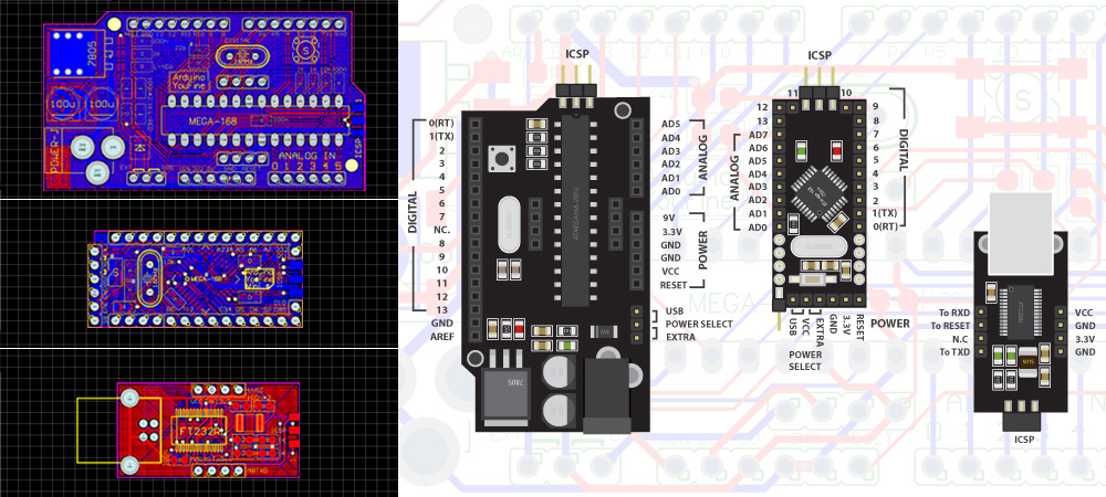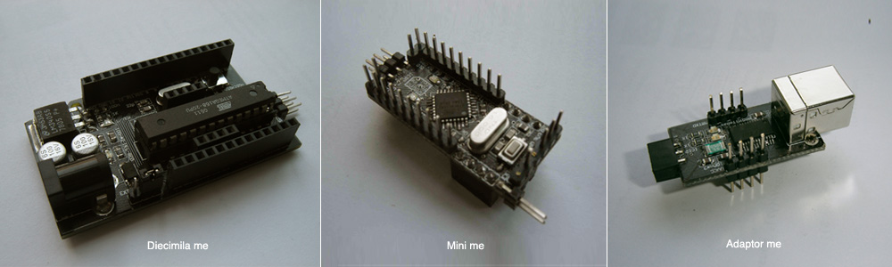 Arduino me is my own version of Arduino Diecimila and Mini, which includes three boards and I call them:
