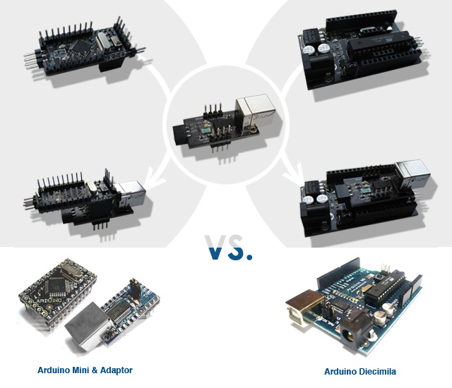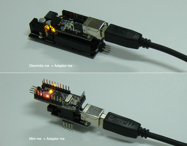 I re-designed the board and the USB adapter was separated from the original Arduino Diecimila as an independent function module. That's saving the expense of buying the extra adaptor and now the adaptor can serve for Diecimila and Mini both.