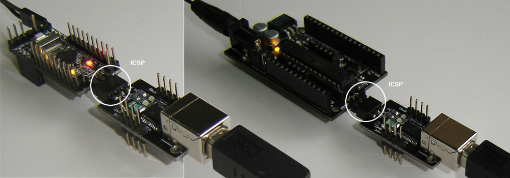 In my version, a new feature is using the Adaptor to burn the bootloader. You just need to connect the ICSP pins together (showen above) and follow the instructions described in this website.
