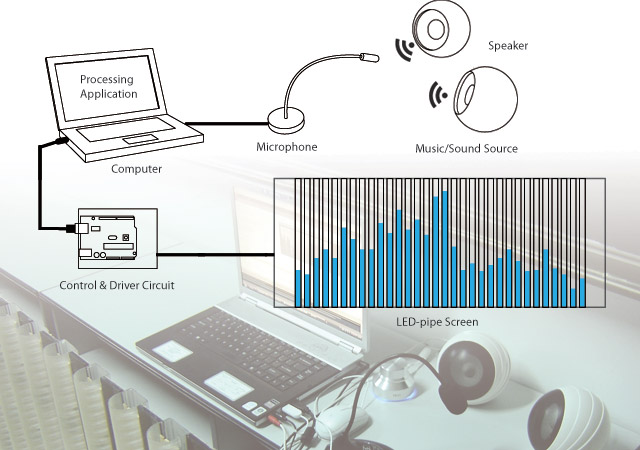A mircophone is used as a input device to acquire the audio signal from the music/sound environment. After analyzing the wave date form the microphone in the processing application, the digital date is sent to the control circuit, which drives the LED screen displaying in real time.