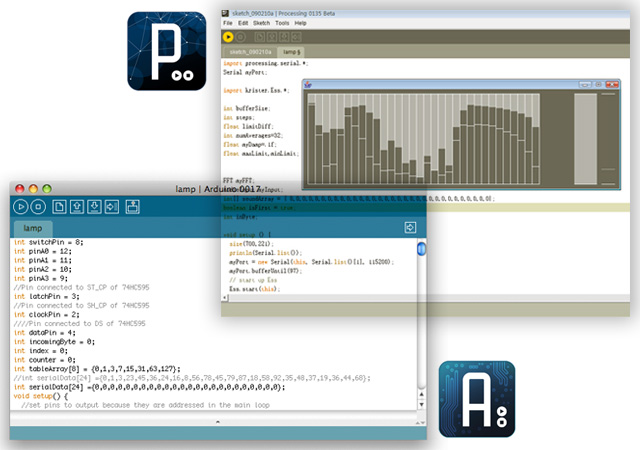 Arduino and Processing are used for the hardware and software programming and I used the serial communication to exchange data beweeen them. In the processing program, I used the Ess r2 library to anaylze the input music/sound. Frequency and loundness are two main parameters in relation to the movement of the screen display.