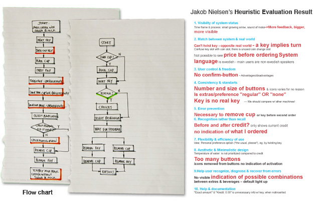 From the observations and interviews, we made a flow chart to clear understanding how the user interact with the current machine. We then highlighted the problems by using the Heuristic Evaluation method.