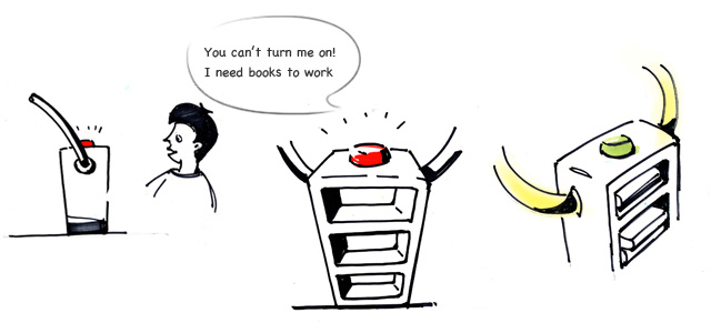 Putting books into the bookcase is like the charging process for the battery. In this metaphor, books are the power source both for the lamp and your brain.