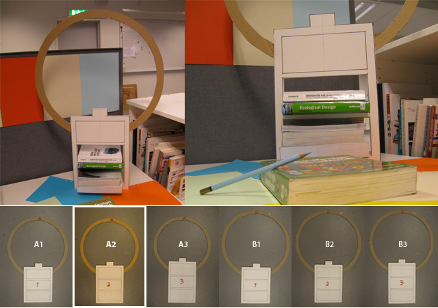 To get the scale and proportion right, I built mockups with different sizes of the light bulb and the body. From the feedback collected by going around and asking people, A2 (shown in the picture) was chosen from the combinations.