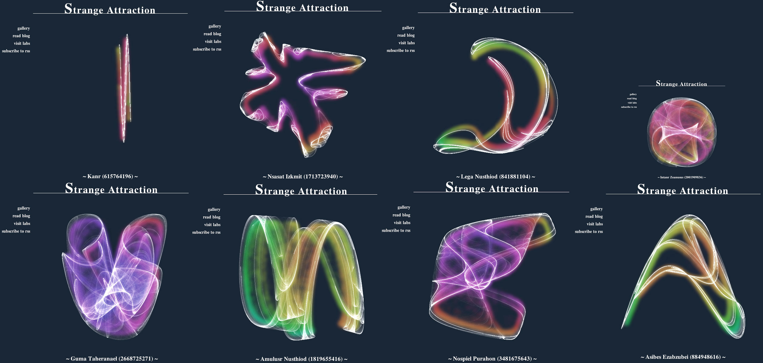 Strange Attraction (try it here) is an random-shape-generator made with JavaScript and Canvas. Done by Jacob Seidelin.